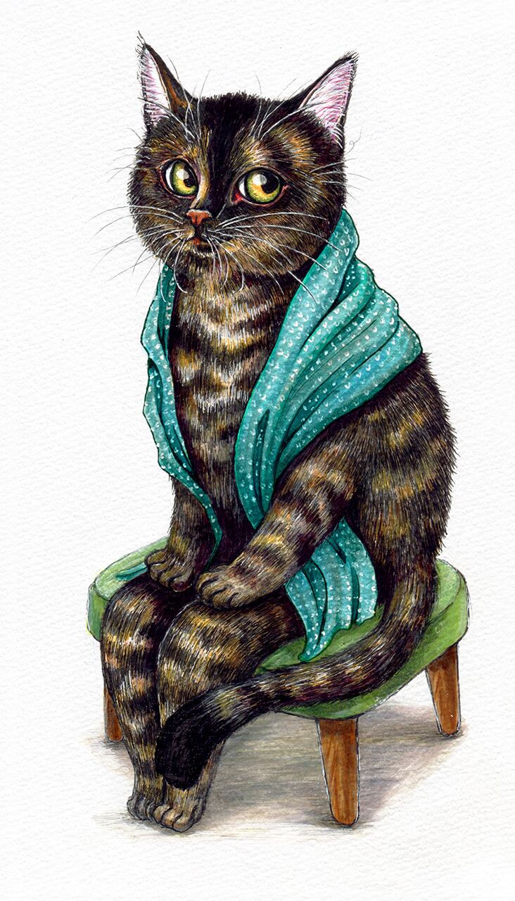 No.179 サビ猫とお気に入りのストール 細密画 原画 / No.179 Original Fineliner Artwork