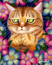 No.186 物憂げな猫と花 細密画 原画 / No.186 Original Fineliner Artwork