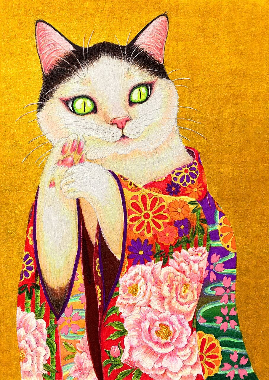 No.154 色打掛を羽織るねこ 細密画 原画 / No.154 Original Fineliner Artwork