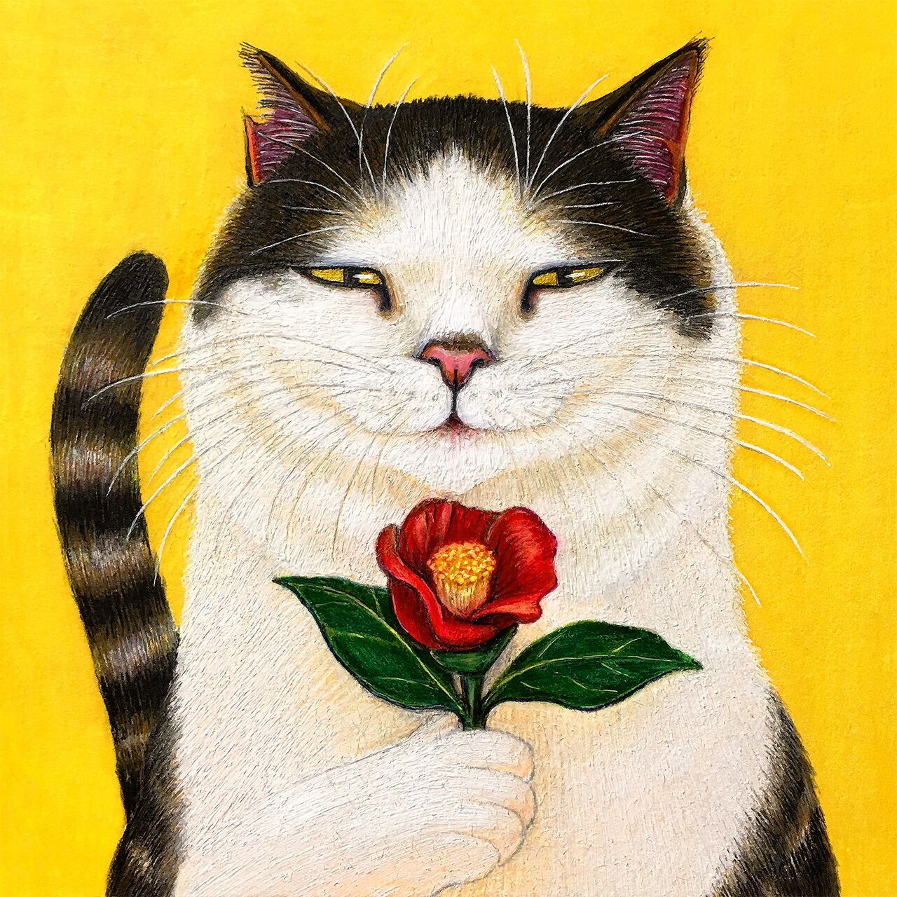 No.134 深紅の椿とねこ 細密画 原画 / No.134 Original Fineliner Artwork