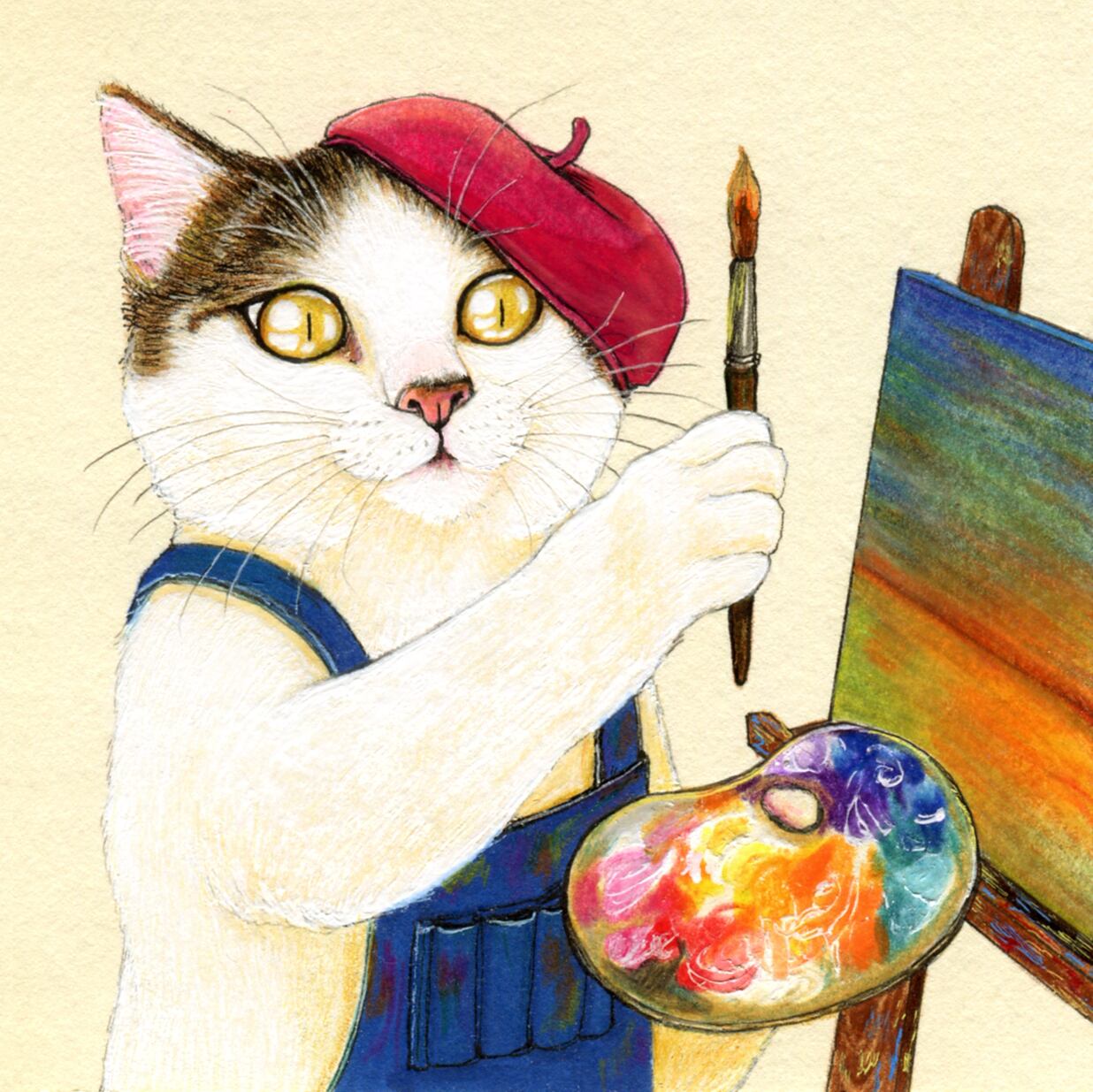 No.066 画家のねこ、熱心に描く 原画 / Original Fineliner Artwork