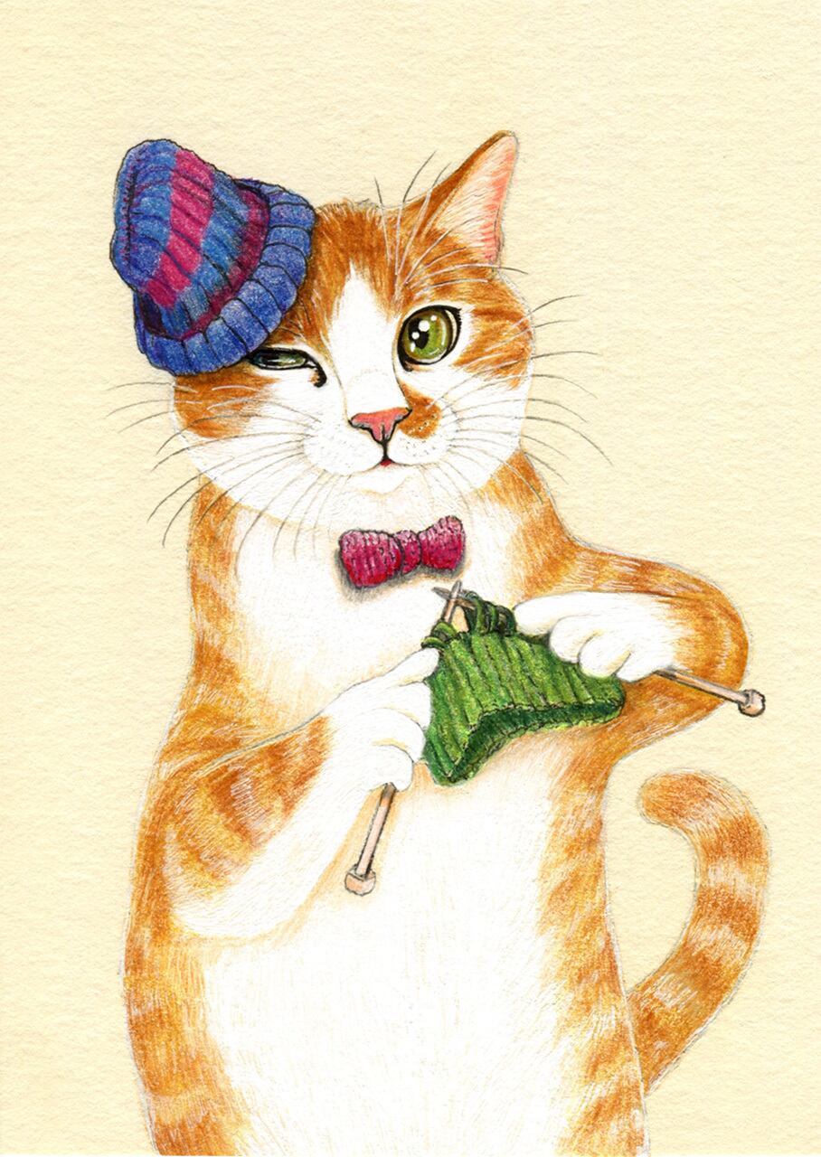 No.049 編み物をするねこ 原画 / Original Fineliner Artwork