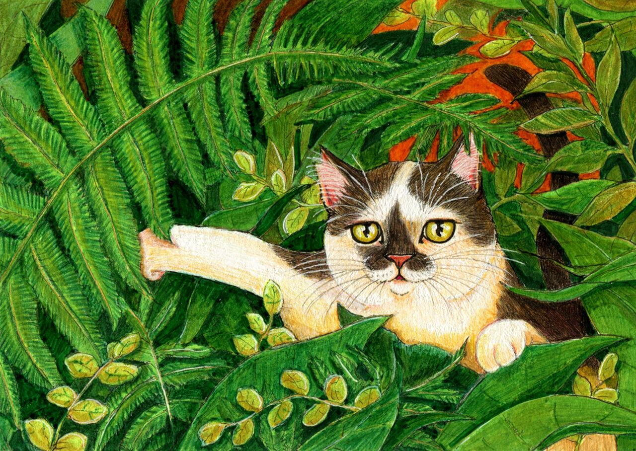 毛の一本一本を何色ものペンで描き上げた細密画の質感をお楽しみください。